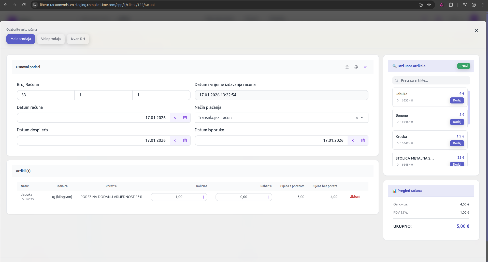 Na dnu desno vidite pregled iznosa (osnovica, PDV, ukupno). Kad je sve točno, spremite račun.