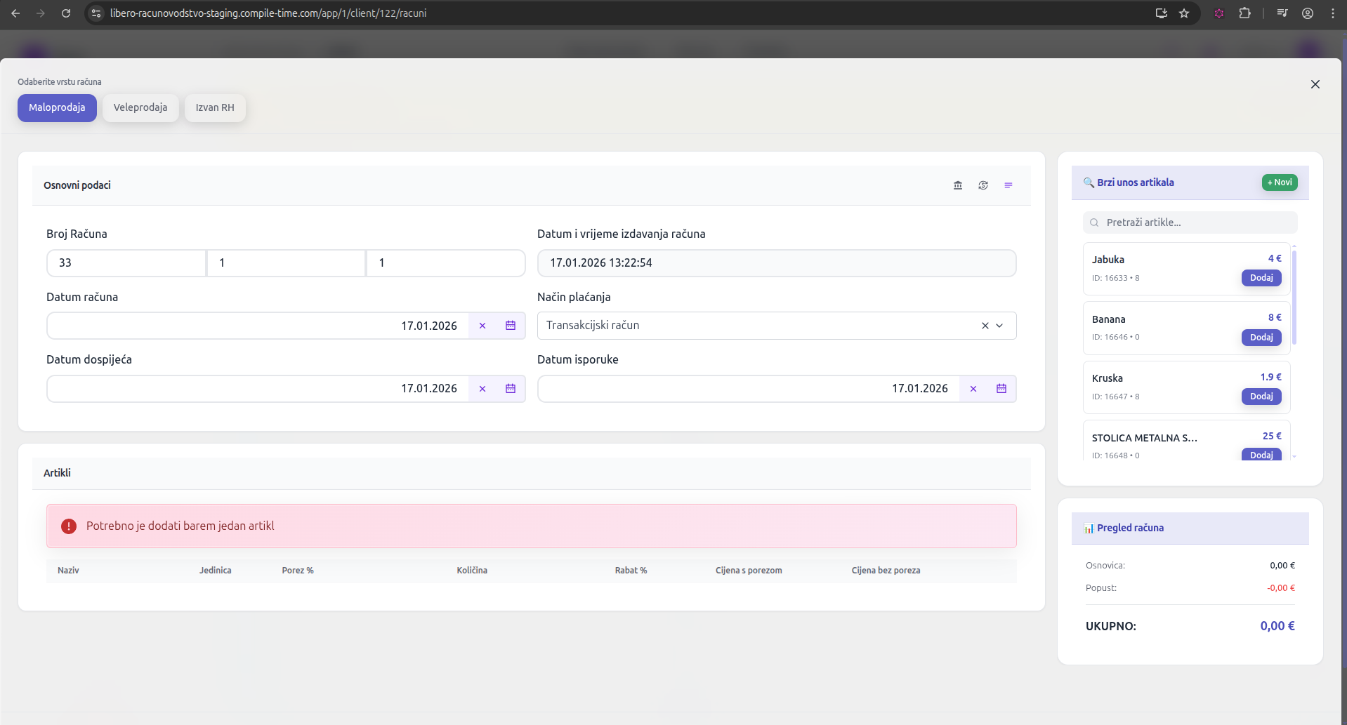Artikle dodajete s desne strane (brzi unos) ili klikom na "Novi". Količine i rabate možete mijenjati u tablici.