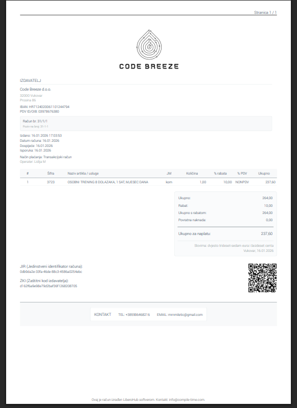 Operater je osoba koja izdaje račun. Telefon i e-mail su kontakt podaci po potrebi.