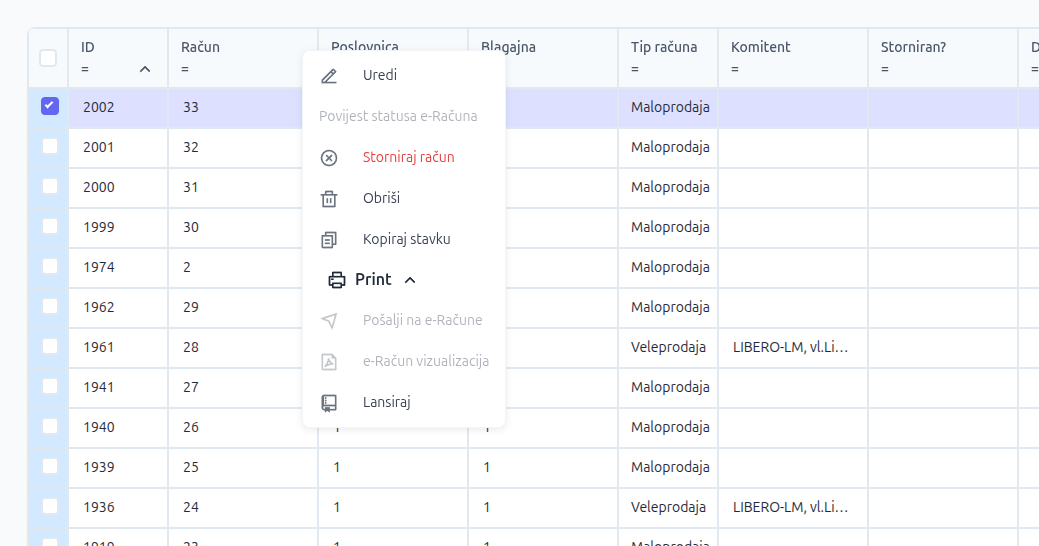 Izbornik akcija za račun (print, storno, eRačun) · Kliknite za uvećanje