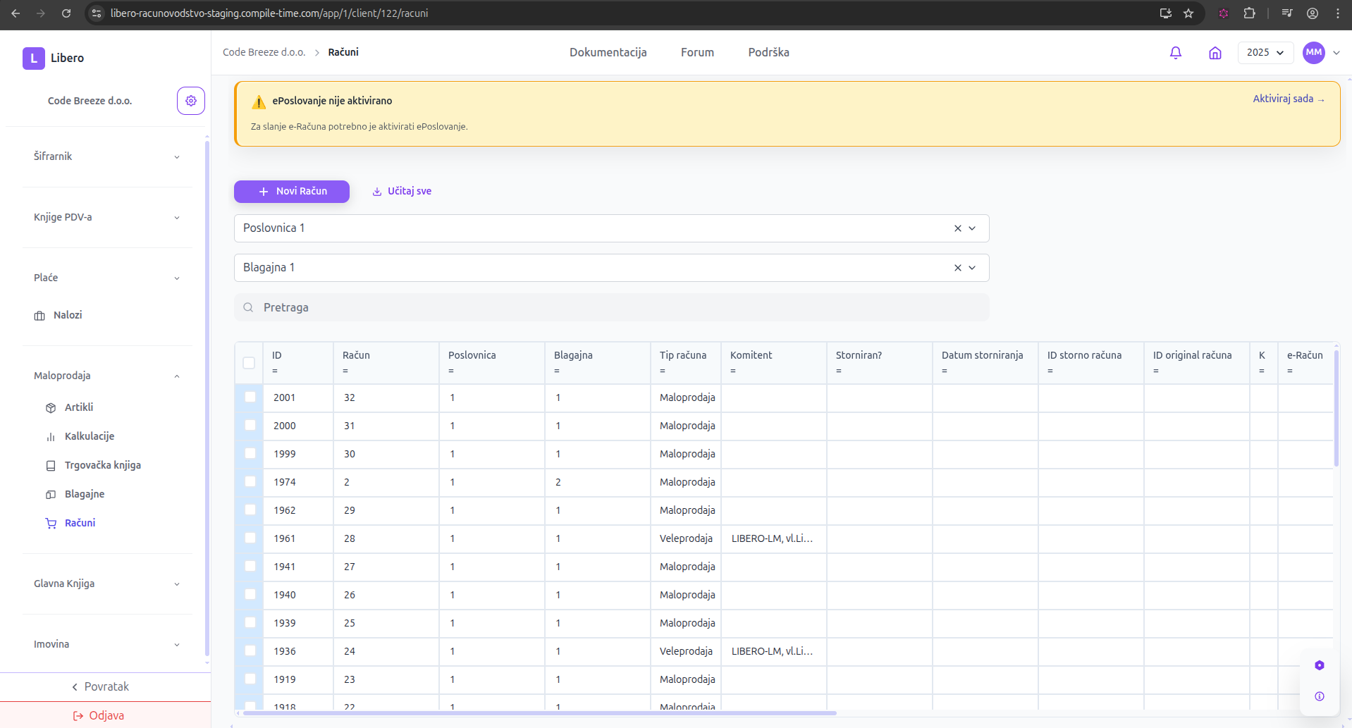 U fiskalizaciji otvorite modul Računi. Na vrhu izaberite poslovnicu i blagajnu. Tek tada je gumb "Kreiraj račun" aktivan.